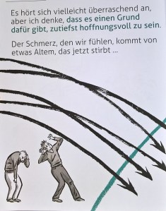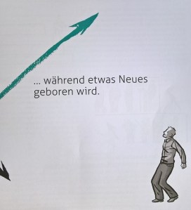 Diese Fotos aus „Reinventing Organizations visuell – Ein illustrierter Leitfaden sinnstiftender Formen der Zusammenarbeit“ Teil 1, Seite 16 und 17 betonen, dass es einen Grund dafür gibt, zutiefst hoffnungsvoll zu sein. Der Schmerz, den wir fühlen, kommt von etwas Altem, das jetzt stirbt… während etwas Neues geboren wird.