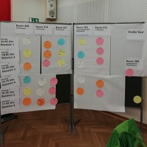 Sessionangebote (innnerhalb von ca. 45 Minuten) gab es dank der großen Teilnehmeranzahl mehr als genug. So sah die Sessionplanung für Samstag aus.