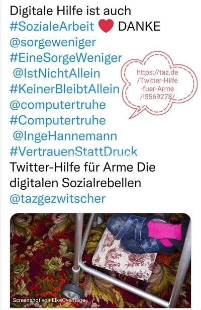 Kein Geld für eine neue Waschmaschine oder Urlaub? Wo der Sozialstaat versagt, versucht eine Initiative, armen Menschen zu helfen – per Twitter. Link zum TAZ Artikel (https://taz.de/Twitter-Hilfe-fuer-Arme/!5569278/)