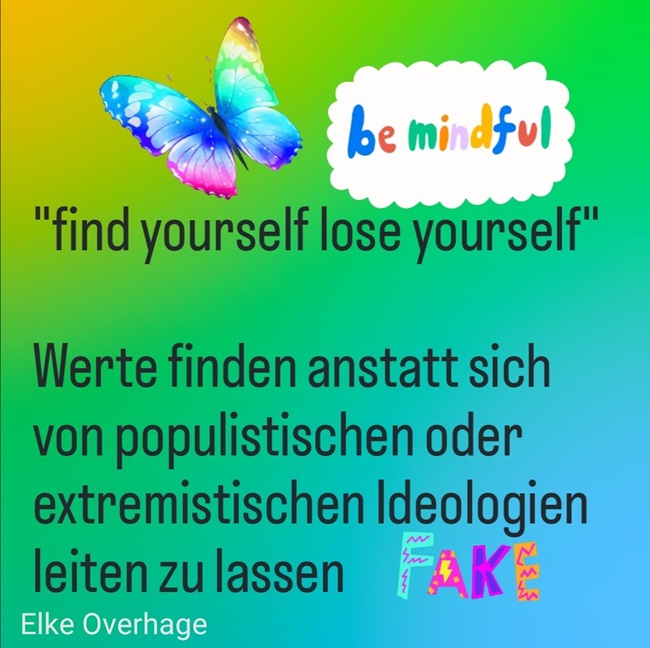 Das Zitat „Find yourself, lose yourself“ kann in einem politischen Kontext gesehen, um die Idee zu vermitteln, dass man sich selbst und seine Werte finden kann, anstatt sich von populistischen oder extremistischen Ideologien leiten zu lassen. Eigene Überzeugungen und ein eigenes Selbst (Identität) ermöglicht erst, eine informierte und bewusste Wahl zu treffen. Anstatt sich von Angst oder Polarisierung leiten zu lassen. Dies ist die Voraussetzung für eine Fokussierung auf eine inklusive, respektvolle und solidarische Gesellschaft. Die eigene Stimme zu finden, ermöglicht, sich für Werte einzusetzen, die Vielfalt und Toleranz fördern, anstatt sich von extremen Positionen beeinflussen zu lassen.