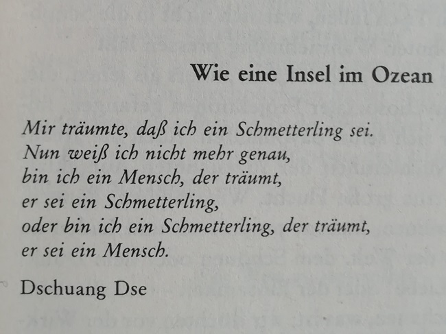 „Mir träumte, daß ich ein Schmetterling sei. Nun weiß ich nicht mehr genau, bin ich ein Mensch, der träumt, er sei ein Schmetterling, oder bin ich ein Schmetterling, der träumt, er sei ein Mensch“ Dschuang Dse