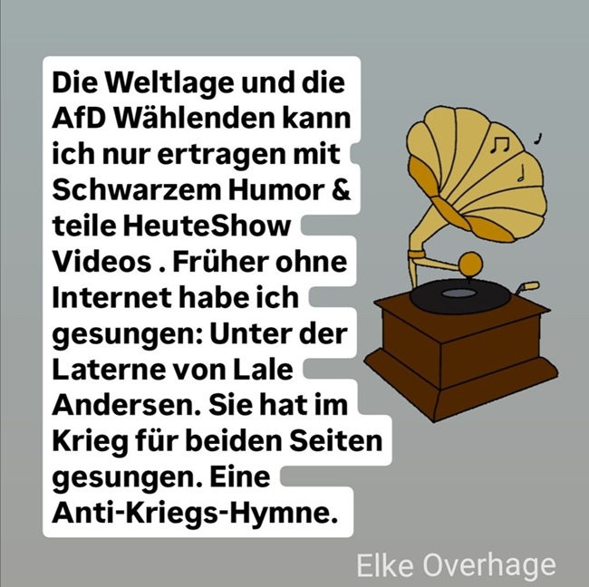 Die Weltlage und die AfD Wählenden kann ich nur ertragen mit Schwarzem Humor und teile „Heute Show“ Videos . Früher ohne Internet habe ich gesungen: „Unter der Laterne“ von Lale Andersen. Sie hat im Krieg für beiden Seiten gesungen. Eine Anti-Kriegs-Hymne.